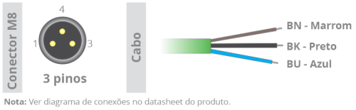 - Duas saídas de comutação, uma delas programável como IO-Link e a outra como saída analógica