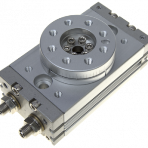 O Cilindro Rotativo de Mesa CRM é um atuador pneumático da família dos osciladores, dispositivos que permitem movimentos de giro do cabeçote, limitados à 190⁰. Através de 2 parafusos no topo do componente, pode-se selecionar o angulo do setor circular e a posição de operação. Equipado com êmbolo magnético, permite a utilização de sensores, que monitoram o funcionamento. Montado com rolamento, possui giro suave, com precisão de 0,01 mm, podendo operar nas posições - Vertical e Horizontal. Através do Furo Central, permite-se a passagem de Hastes, Fios, Tubos, etc. Disponíveis nos modelos 10, 20, 30 e 50, com cilindros internos nos diâmetros 15, 18, 21 e 25 mm, respectivamente. Possui amortecimento Fixo (batente de borracha) e trabalham com pressões de até 10 bar e Temperaturas de 0 ⁰C à 60 ⁰C. Com dimensão compacta, tem excelente estabilidade e acabamento, sendo intercambiáveis com a maioria dos similares do mercado. Utilizado nas mais variadas aplicações de automação, onde realizam, manipulações, posicionamentos, montagens, etc.