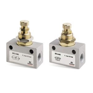 São válvulas redutoras de vazão, que operam com o mesmo ajuste de restrição, em ambas as direções de fluxo. Disponíveis com roscas fêmeas, nas bitolas de 1/8”, 1/4", 3/8” e 1/2" BSP. Resistentes, duráveis e com designer moderno, oferecem garantia de ótimo desempenho nas aplicações, onde são solicitadas. Versáteis, podem ser fixadas por furações laterais, pelas roscas das conexões ou pelo pescoço, com contra porca, para montagens flangeadas ou painéis. Utilizadas em geral, para ajustar a vazão em vias onde o sentido de fluxo não é reversível, como: controle de velocidade de motores pneumáticos, dosagens de sopros ou jatos de ar, ajuste de alimentação de circuitos, etcDescrições técnicas